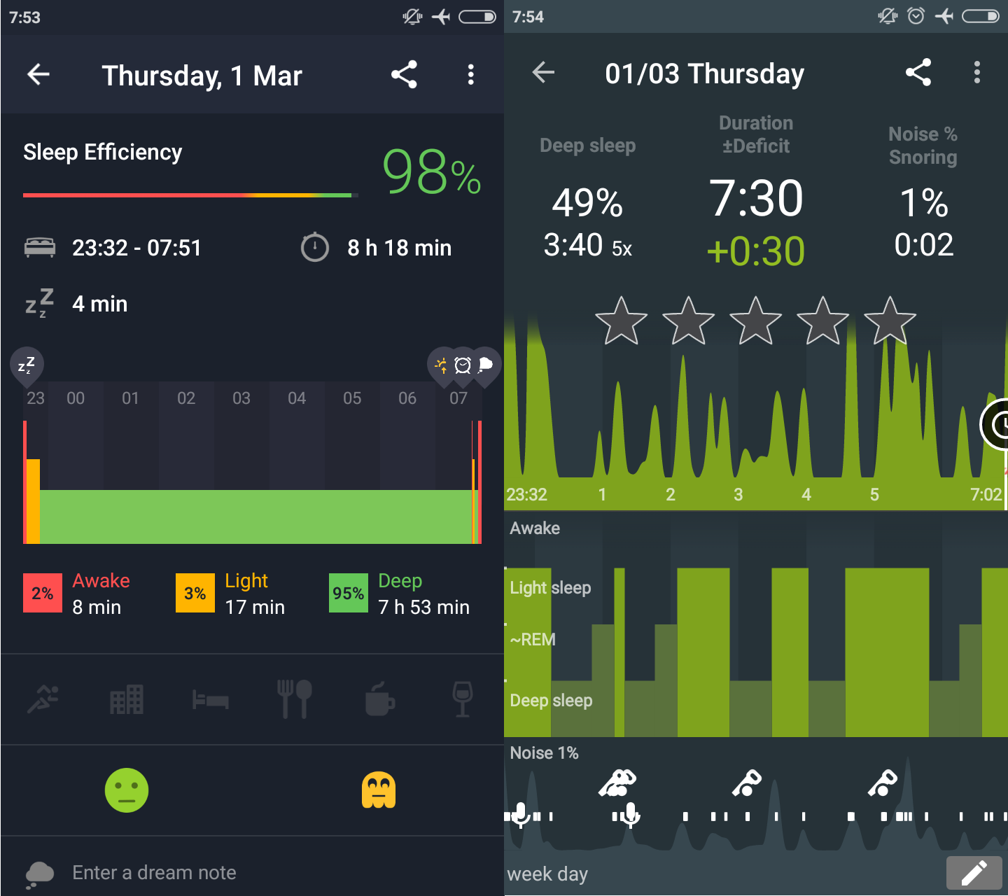 Now, I realise that on the left (Sleep Better) I have 20 minutes more sleep on the counter, but that doesn’t really matter because I wasn’t asleep anymore. I just didn’t want to leave my cozy warm bed. But back to my sleep tracking apps. Sleep As Android (Link) seems to be much better at figuring out how restless I am in bed because there’s no way I just had almost 8 hours of deep sleep. But Sleep Better (Link) isn’t always this bad. I’ve had nights after which it showed me how rough my sleep was. Although, to be fair, it hasn’t been working for the past three days, telling me I didn’t sleep at all. So maybe it just needs more practice and I shouldn’t be so hard on it.
